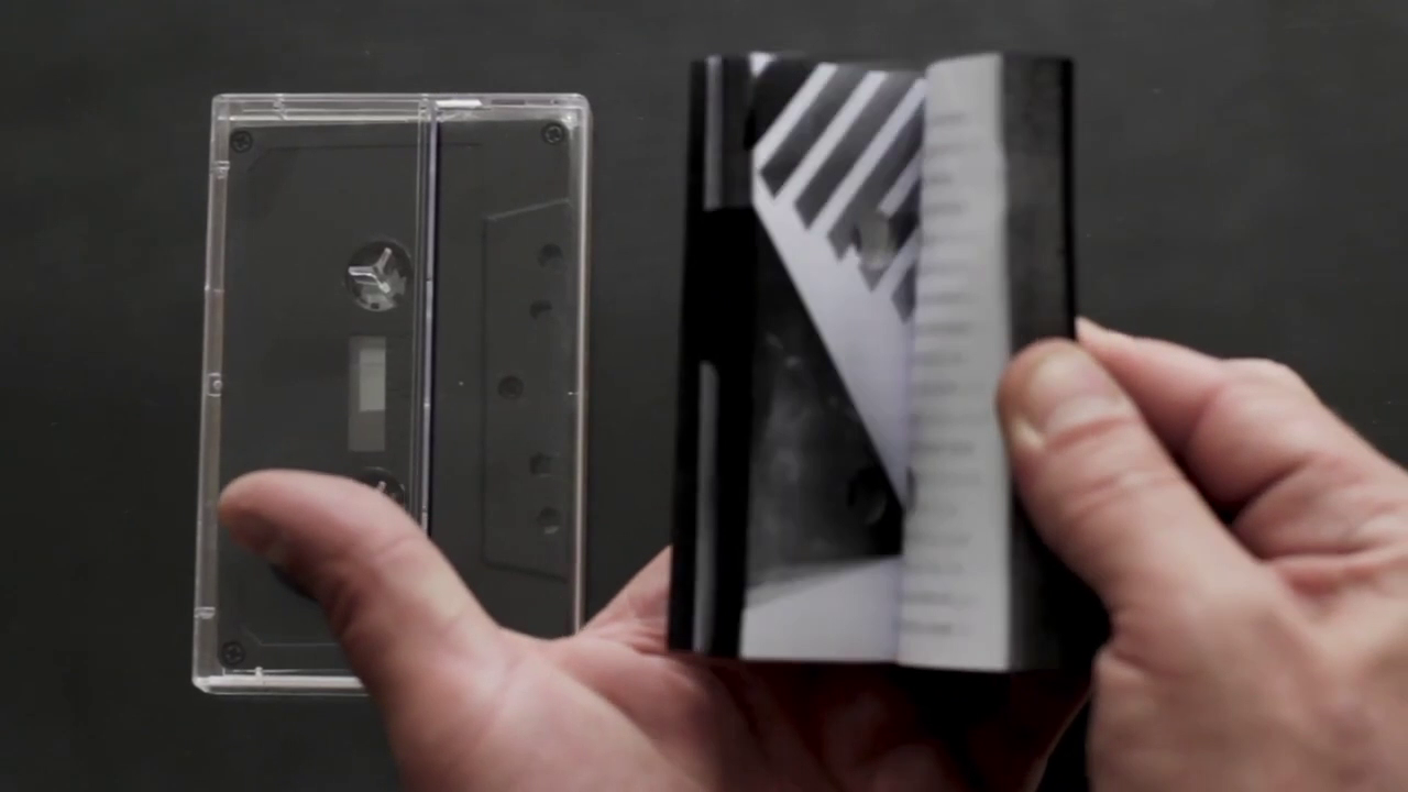 —Tanto el libro como el cassette, tienen su propia caja plástica transparente, las cuales se encuentran reunidas por un elástico negro que abraza ambas cajas en forma diagonal. El elástico es una cámara de bicicleta recortado.