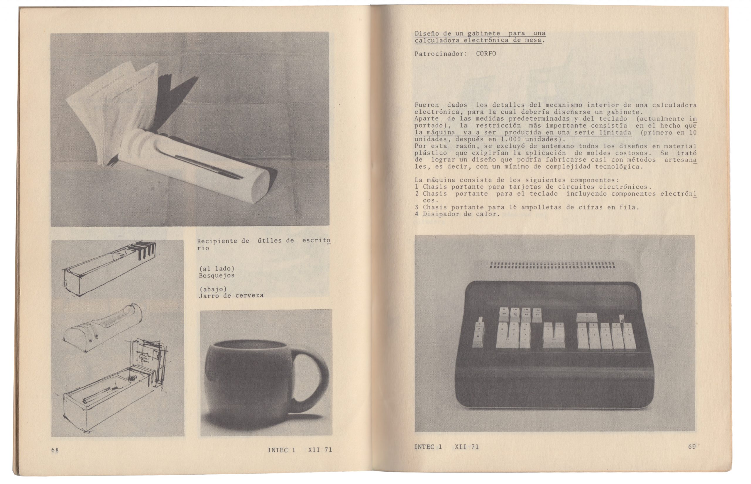 Entre enero de 1971 y septiembre de 1973, el Grupo de Diseño del Comité de Investigaciones Tecnológicas de Chile (INTEC), al interior de CORFO, desarrolló distintos proyectos de bienes de consumo, bienes de capital y bienes de uso público. Estos bienes, serían producidos por la plataforma industrial nacionalizada, y distribuidos por distintos programas del Estado, y por el mercado, Implementándose de esta forma una experiencia específica respecto del rol del diseño en la definición de la cultura material del socialismo. Experiencia implicó el diseño de alrededor de 90 objetos, los que en su mayoría nunca fueron producidos, dada la interrupción del proyecto por parte del golpe cívico militar.