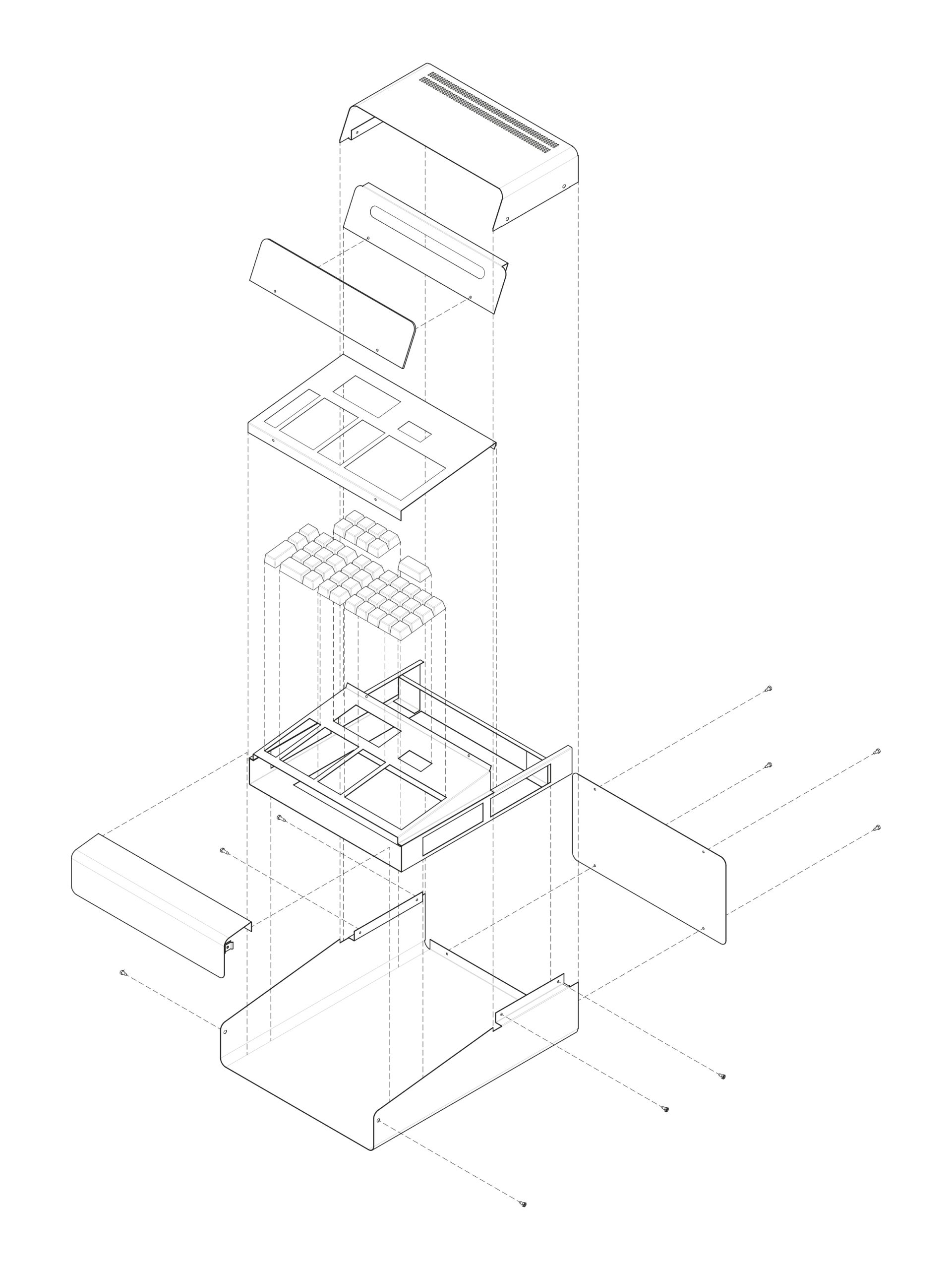 Axonométrica explotada de piezas de gabinete de calculadora electrónica. Por José Hernández.