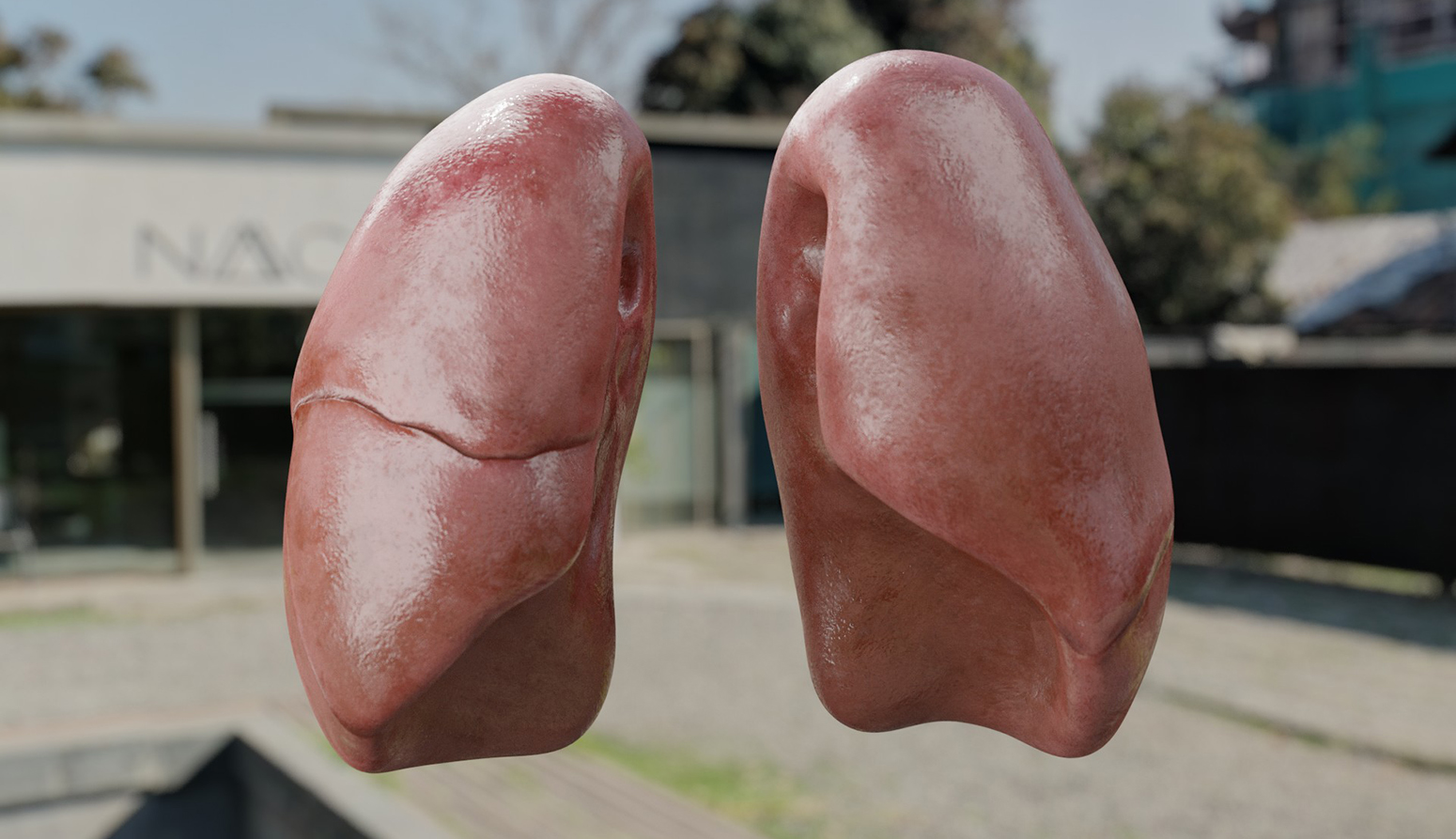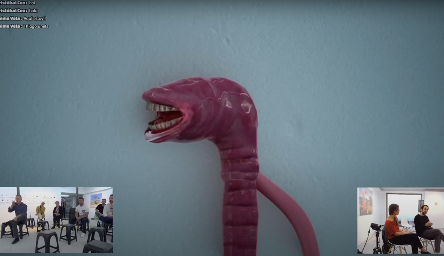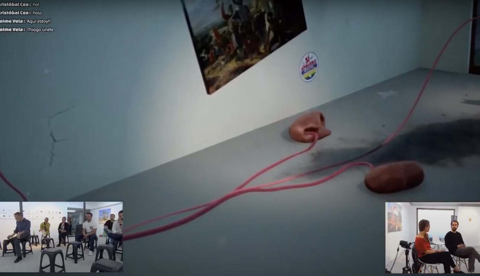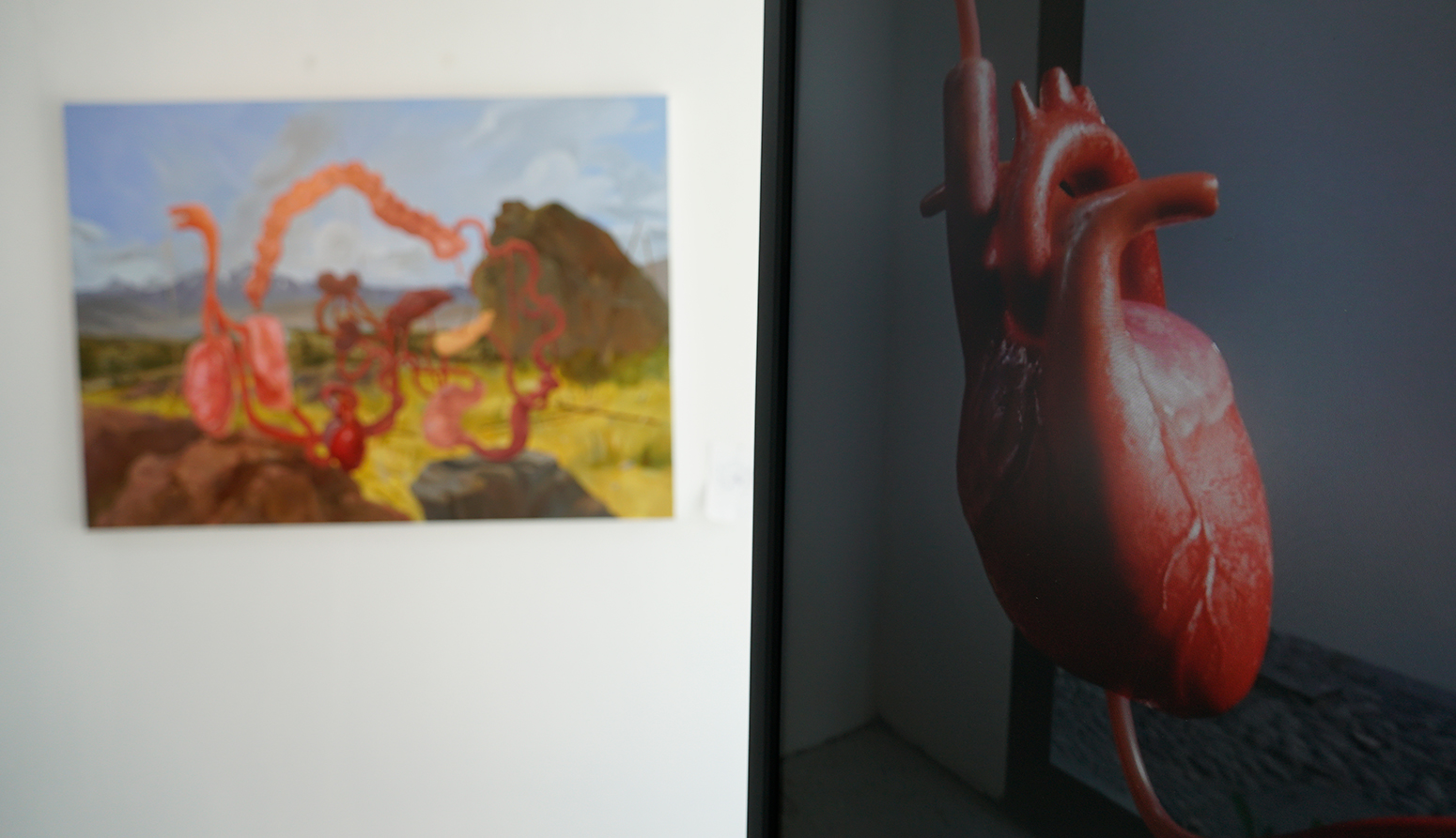 Así, las pinturas de la muestra son la base de los modelos digitales de la misma. Los ´pulmones y el corazon funcionan por costumbre, y la visita online de la muestra -vía un streaming continuo accequible desde youtube – no es un sucedáneo de visita presencial; sino un complemento que permite probar esta muestra que hibrida virtualidad y materialidad, que es simultáneamente cosa extendida y cosa pensante. [1]